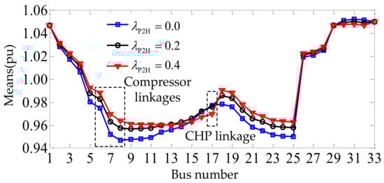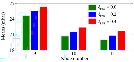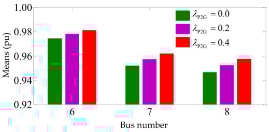As shown in Figure 10, the mean values of gas pressure of nodes 7~9 rise with the increase of λP2G, which indicates that the utilization of P2G is also helpful in improving the gas pressure of the end users. Additionally, it can be seen from Figure 11 that with the increase of λP2G, the voltages of buses 6~8 also increase. This is because the electrical power consumed by compressors decreases owing to the increased gas pressures (see (4) and (5)) and, accordingly, the voltages of the buses connected to the compressors improves.