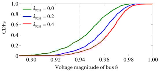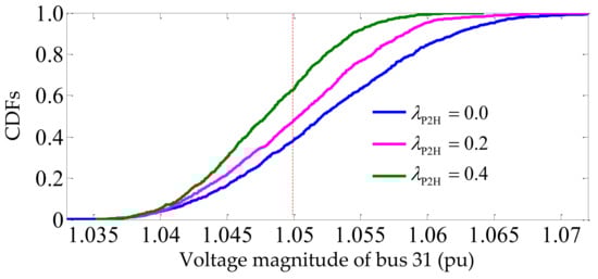 Figure 12 depicts the CDFs of the voltage magnitude of bus 31 (connected to P2H) and Figure 13 gives the mean values of all voltage magnitudes in the electricity network. It can be seen that the utilization of P2H decreases the voltage level of bus 31 (see Figure 13), and thus the probability of bus 31 exceeding its upper voltage limit (see Figure 12), which is similar to the effect of P2G on the voltage of bus 32 in Case 1.