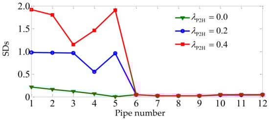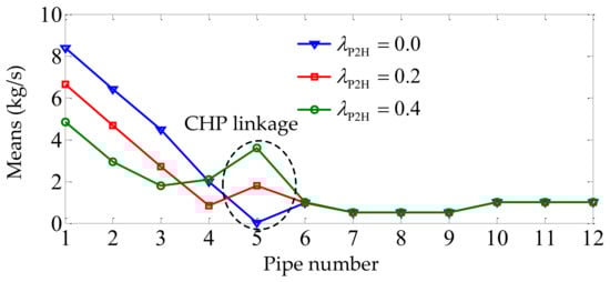 Figure 14 and Figure 15 present the mean values and SDs, respectively, of mass flow rates within pipes in the heating network. It can be observed from Figure 14 that as λP2H increases, the mass flow rates within some heavily loaded pipes (such as pipes 1~3) decrease remarkably, which indicates that P2H may contribute to reducing the potential overloading risks of the heating network. On the other hand, as λP2H increases, the SDs of mass flow rates within the main pipes (i.e., pipes 1~5) notably increases, because uncertainties in wind/solar power are introduced into the heating network via P2H. Note that the effects of P2H on overloading alleviation and SD increase are also similar to the effects of P2G on the gas network shown in Figure 8 and Figure 9 in Case 1.