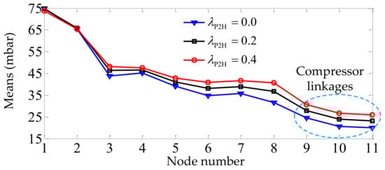 From Figure 16, it can be seen that nodal pressures will increase with the increase of λP2H. This is because the amount of gas consumed by the CHP unit decreases due to its decreased heat and electrical power generation. This decreased gas consumption means a decrease in the overall gas loading level and therefore leads to an increase in nodal pressures.
