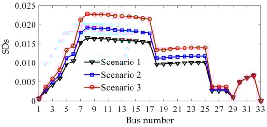 Figure 19 shows that the SDs of the voltage magnitudes at buses 1, 2, and 26~33 are slightly affected by variations in correlation of loads, while the SDs of other buses (especially buses 6~8 and 17) increase notably as the correlation levels increase from Scenario 1 to Scenario 3. This is because buses 1, 2, and 26~33 are near the slack bus (bus 33) of the electricity network, and buses 6~8 and 17 are the buses coupling to the gas and heating networks.