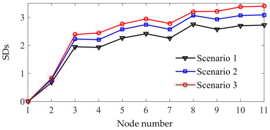 Similar observations can be made from Figure 20. In the gas network, the SDs of pressures of nodes 1 and 2 vary slightly and the SDs of other nodes increase notably from Scenario 1 to Scenario 3. The reason is that node 1 is the gas slack node and node 2 is close to node 1, which is similar to the explanation of Figure 19.