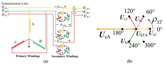 “Sen” transformer (ST) configuration and output voltage. (a) ST configuration; (b) Output voltage phasor USTA.