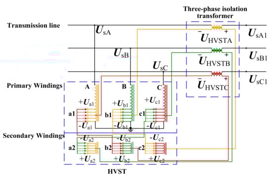 In the HVST, it should be noted that b1, c1, and a1 are tapped at the same number of turns; c2, a2, and b2 are tapped at the same number of turns. However, the number of turns in the b1-c1-a1 set and c2-a2-b2 set can be different. In this way, the compensated three-phase voltage (UsA1, UsB1, and UsC1) can maintain the symmetry.
