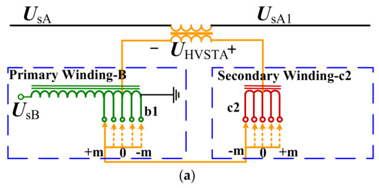 To get a better look at the windings connection mode of the HVST, we show the enlarged structure of the primary winding B and secondary winding c2 in the HVST in Figure 3a. The compensating voltage UHVSTA produced by winding b1 and winding c2 is injected in the sending end of the transmission line phase A via an isolation transformer. The tap changers are adjustable at (0, ±1, ±2,···, ±m) levels. The number and direction of active turns in the winding b1 and winding c2 can be varied with the use of tap changers. Therefore, the compensating voltage becomes variable in magnitude and variable in phase angle.