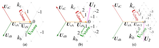 When the tap changers are adjustable at (0, ±1, ±2) levels, the output voltages of HVST are shown in Figure 4b. The number of the compensating vectors is 25 (including a zero vector). For example, when the tap positions in the windings b1 and c2 take the values of kb = −2 and kc = 1, the output voltage UHVSTA is equal to U1.