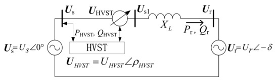 where Us is the magnitude of the sending-end voltage, Ur is the magnitude of the receiving-end voltage, δ is the difference in phase angle between the sending-end and the receiving-end voltages, XL is the reactance of the line. UHVST and ρHVST are the magnitude and phase angle of the series voltage produced by the HVST.