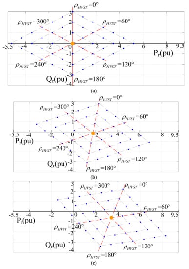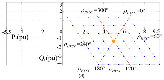 The center point of the rhombus is the Pr-Qr operating point without HVST compensation. The discrete points on the three rhombuses are the Pr-Qr operating points with HVST regulation. It can be seen from Figure 6 that the HVST can provide the functions of independent and bidirectional control of active and reactive power flow. The HVST can expand the Pr-Qr operating range of the power system.