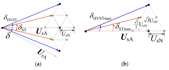 Assuming that UsA = 1 pu, we can get the maximum phase-shift angle produced by the ST and the HVST, as shown in Equations (9) and (10).