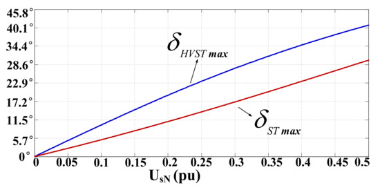 When the range of values allowed for UsN is 0 to 0.5 pu, the curves of maximum phase-shift angle produced by the ST and the HVST are shown in Figure 8.