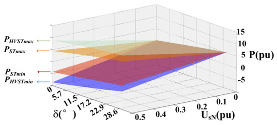 Figure 4 and Figure 6 show that, when the HVST output voltage takes the values of and , the active power flow at the receiving end of the transmission line reaches the maximum and minimum values, respectively. Besides, when the ST output voltage takes the values of and , the active power flow at the receiving end of the transmission line reaches the maximum and minimum values, respectively. Combining with Equation (7), we can get the maximum active power flow controlled by the HVST and the ST: