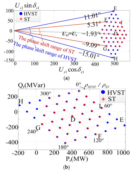 Similar to the above analysis, we can get the following conclusions. When the parameter δ ranges from 30° to 60°, the HVST has a larger active and reactive power flow regulatory region than the ST; when the parameter δ ranges from 60° to 90°, the HVST has a larger reactive power flow regulatory region than the ST.
