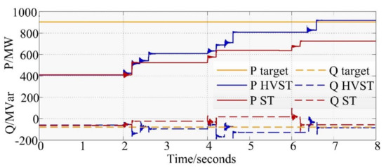 Transient compensation is compared using the ST or the HVST. In the simulation, the ST or HVST starts to operate at 2 s. The relevant simulation parameters are shown in Table 2. The initial active and reactive power flows are 405 MW and −61 MVar. The control targets of active and reactive power flows are 900 MW and −100 MVar. Figure 11 shows the active and reactive power flows, Pr, and Qr, of the transmission system for the ST and the HVST.