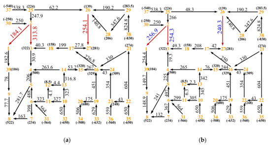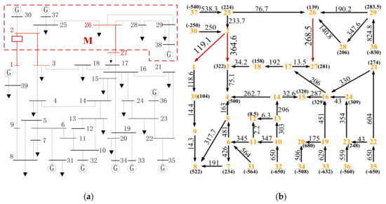 In Figure 12b, the numbers 1 to 39 represent the buses of power system. The positive numbers and negative numbers in the brackets by the side of the buses represent the active loads and active power outputs, respectively. The arrows show the direction of the active flows in the transmission lines and the data on the arrows show the value of the transferred active power flows. The unit of active power is the megawatt (MW).