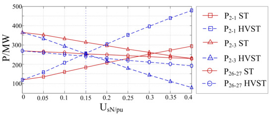 In the same simulation condition (UsN = 0.15 pu), the active power flow distribution compensated by the HVST is shown in Figure 13b. The active power flows on the transmission lines 2-1, 2-3, and 26-27 are 256.9 MW, 254.3 MW, and 240.3 MW, respectively. The active power flow difference among the three transmission lines is no more than 7 percent. They are distributed evenly. This analysis proves that the regulation capacity of the HVST is higher than that of the ST in the same rated voltage.