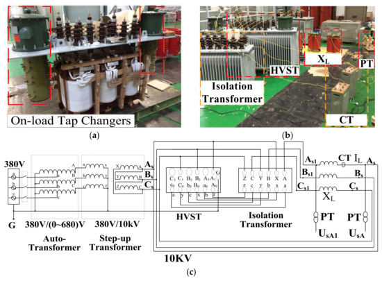 The 10 kV HVST device and the corresponding experimental platform are shown in Figure 15a,b. Figure 15c shows the corresponding equivalent circuit of this experimental platform. The reactance XL is used to simulate the transmission line. The potential transformer (PT) and current transformer (CT) are used to obtain the measuring voltage and measuring current.