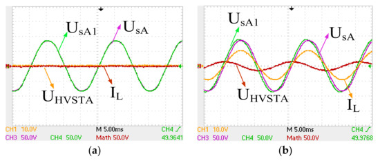 Figure 16a,b show that the HVST tap changers positions (kb, kc) are tapped at (0, 0) and (−2, 2), respectively. The CH1 waveform shows the line current IL, the CH3 waveform shows the sending-end voltage UsA, the CH4 waveform shows the compensated sending-end voltage UsA1, and the Math waveform shows the HVST output voltage UHVSTA.
