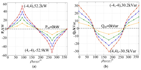 The Pr and Qr experimental results at a varying series voltage (UHVST) and phase angle (ρHVST) for the HVST. (a) The active power flow Pr; (b) The reactive power flow Qr.