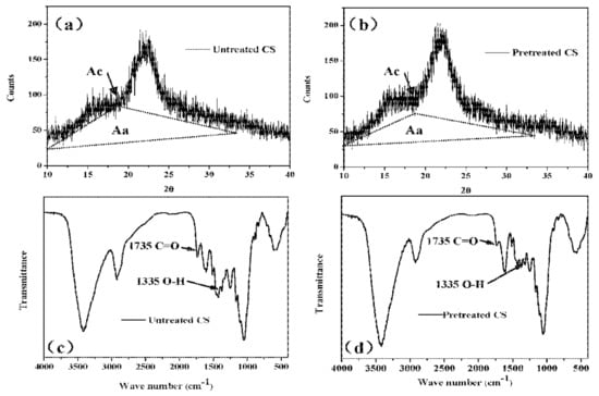 X-ray diffraction patterns and FTIR spectra of: (a,c) untreated corn straw (CS); and (b,d) pretreated CS with biogas liquid in the pilot-scale test. Ac and Aa represent the crystalline and amorphous portions of the X-ray diffractogram, respectively.
