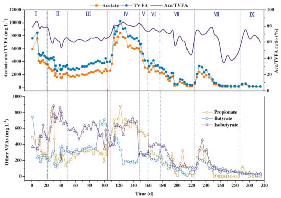 Acetate is one of the main raw materials for synthesizing methane. Unlike fermentative culture in vivo, the acetate/TVFA ratio is more important than the acetate/propionate ration in a biogas production system [38]. It was demonstrated from the overall process of the pilot-scale test that when a phenomenon of inhibition of microbes or incomplete metabolism of intermediate products occurred during digestion, the acetate/TVFA ratio was above 0.6 in most cases. When the ruminal digestion system worked in good condition, the acetate/TVFA ratio decreased to nearly 0.4. This ratio may be considered an indirect index reflecting the properties of anaerobic digestion.