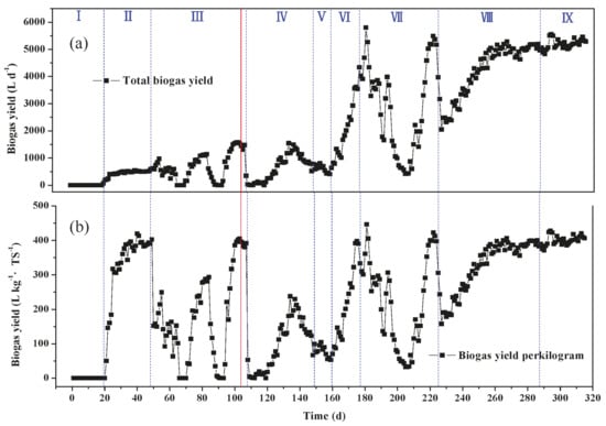 Biogas yield of the anaerobic digestion process in the pilot-scale test, (a) total biogas yield and (b) biogas yield per kilogram.
