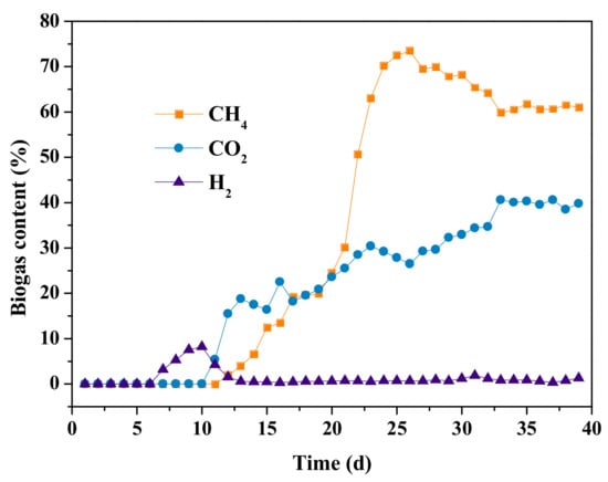 Figure 3 provides details of the total biogas yield and biogas per kilogram produced by the anaerobic digestion system. At the beginning of the inoculation and starting up, a relatively low yield of biogas was observed on account of insufficient methanogens in the original rumen microorganisms. The total biogas yield rapidly increased up to 410 L·d−1 on day 25 and then gradually stabilized at 500 L·d−1 on day 33. The biogas yield per kilogram was about 385 L kg−1·TS−1. Examining the biogas content at the beginning of degradation in Figure 4, it appeared that hydrogen was firstly detected in the reactor. The hydrogen liberated by hydrogenase enzymes arose from either phosphoroclastic reactions or nicotinamide adenine dinucleotide (NADH) during the drastic hydrolysis of CS by the rumen microorganisms [39]. Methane and carbon dioxide were detected almost at the same time on day 11. After a sharp increase from day 11 to day 25, the peak content of methane was achieved at 73.44%, followed by a gradual decline to about 60% on day 33. The variation tendency of methane was similar to the results of Zhao et al. [40], demonstrating that the acclimation of methanogens in the rumen microorganisms could be conducted within 25 days for biogas production. The content of carbon dioxide gradually rose up to about 40% on day 32. At this point, it could be identified from the stable biogas yield and biogas components that the ruminal pilot-scale anaerobic digestion system was operating successfully.