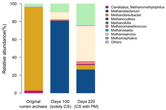 The digestate samples were collected on days 100 and 220 to determine the archaeal communities at both the solely CS and mixed substrates digestion phases, respectively. The samples, including original rumen archaea, were frozen at −80 °C immediately. Genomic DNA was extracted from each sample with an E.Z.N.A Soil DNA kit (OMEGA, Atlanta, GA, USA) according to the manufacturer’s instructions. PCR amplification was performed using specifically synthesized primers with a barcode of Arch519F (5’-CAGCCGCCGCGGTAA-3’) and Arch915R (5’-CAGCCGCCGCGGTAA-3’) in a PCR thermal cycler Dice (BioRad Co. Ltd., Berkeley, CA, USA) using the following program: 2 min of denaturation at 95 °C, followed by 27 cycles of 30 s at 95 °C (denaturation), 30 s for annealing at 55 °C and 1 min at 72 °C (elongation), with a final extension at 72 °C for 10 min. After amplification, the PCR products were purified, quantified, and then pooled at equal concentrations. Finally, the PCR products were sent to Majorbio Bio-Pharm Technology Co., Ltd. (Shanghai, China) for high-throughput sequencing using paired-end sequencing with an Illumina MiSeq PE300 platform (San Diego, CA, USA).