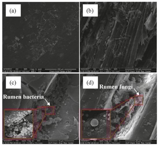 SEM images of: (a) undigested CS, (b) digested CS, (c,d) rumen microorganisms’ adhesion on the surface of CS.