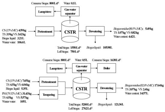 Figure 7 shows the mass balances determined for the two typical and steady sections including stage III (solely CS at 3% solid content) and stage VII (1:1 mixture ratio of CS with PM at 10% solid content). As shown in Figure 7a, for the TS and VS mass balance, the input of solely CS was mostly converted into biogas, which achieved 72.56% and 77.35% removal rates, respectively. For the water, balance, the main pathway of the moisture in the feedstock included biogas liquid, biogas residue and gas–water separator. Biogas was used for the lamp and stove, resulting in 51.6% consumption. The mass balance and final fate of the product from the two sections were slightly different. The residual materials of the co-digestion system originated from two substrates, including the pretreated CS and PM, resulted in an improvement of the TS and VS removal rate to 76.38% and 79.33%. Due to the increase of biogas yield, the consumption rate declined to 46.88%.