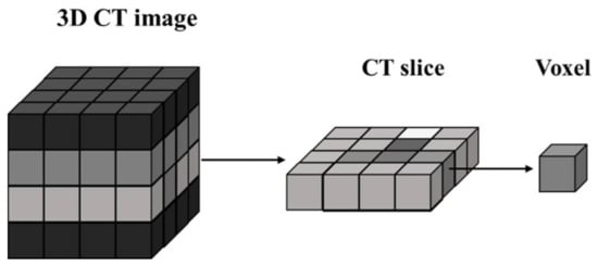As shown in Figure 2, a complete 3D object is composed of a contiguous set of CT images, called “slices” because they correspond to what the object would look like if it was opened along a plane. While a 2D image is made up of pixels, a CT slice is formed with voxels. The voxel is a 3D cube that represents the gray-scale value at that location. The gray-scale value corresponds to X-ray attenuation, which reflects the proportion of X-rays absorbed or scattered as they pass through each voxel [21].