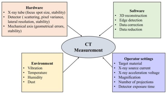 Figure 3 shows factors that influence the CT measurement [22]. The parameters that can be selected and controlled by the operator include: the target material, the power of the X-ray source (source current, acceleration voltage), magnification, number of projections, and detector exposure time [23]. Selection and adjustment of the parameters may require test measurements and iterative procedures.