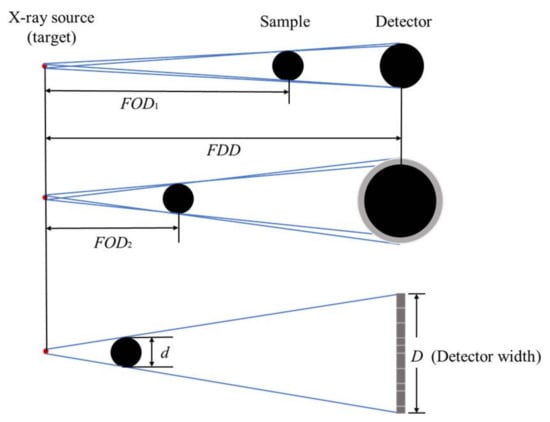 The resolution of a CT scanner is usually represented as the voxel size (vs). The voxel size is determined by the magnification (M) and the pixel-to-pixel distance of the detector (dis). As shown in Figure 5, the magnification is defined as the ratio of the source-to-detector distance over the source-to-sample distance [31]: