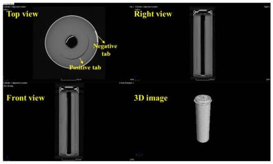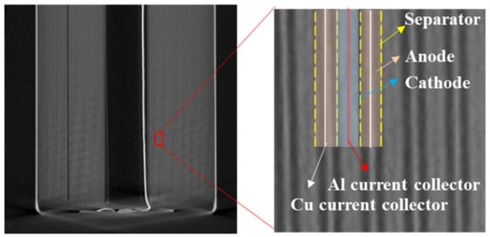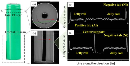 Cylindrical batteries are manufactured by winding the cathode and the anode layer separated by a separator into a jelly roll. The cathode current collector is connected with the cap (positive terminal) using the positive tab (typically Al). The anode current collector is connected with the outer casing (negative terminal) using the negative tab (typically Ni), which is isolated from the cap by an insulating ring. Figure 6a,b show the axial and front CT scan images of a cylindrical lithium-ion battery. The X-ray attenuation and the gray-scale value typically increase as the atomic number of the element increases [35]. The anode current collector (Cu) and negative tab (Ni) have higher atomic numbers than the cathode current collector (Al) and anode material (C). Thus, the elements with high atomic numbers, such as the anode current collector (Cu), have high X-ray attenuations and gray-scale values and are displayed as white in the CT images. While the elements with low atomic numbers, such as the anode material (C), have low gray-scale values and are shown as black.