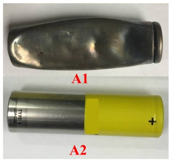 On 10 January 2017, an e-cigarette exploded in a user’s pants pocket. Two samples in Figure 9 are related to this incident. A1 is the subject battery that exploded in this incident while A2 is a backup battery of identical make and model. These two samples are rechargeable cylindrical 18650 cells with 3000 mAh nominal capacity.