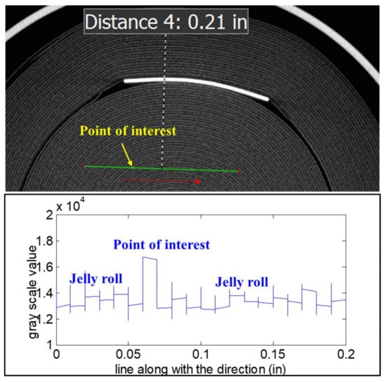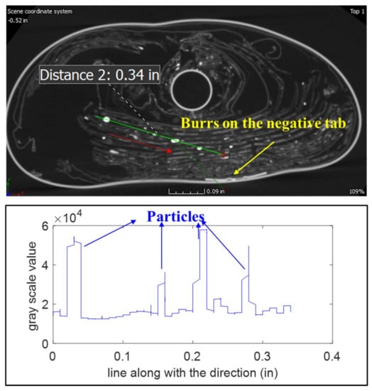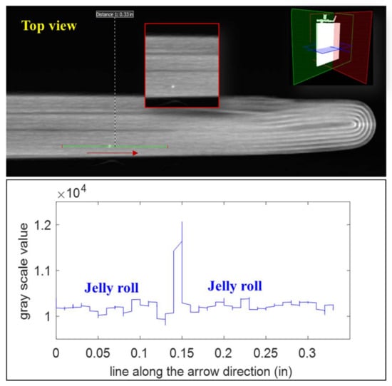 Foreign particles were observed in different places inside the sample B1. Figure 17 shows a bright point inside B1 from different views. Figure 18 shows the gray-scale values of the marked green line crossing this point. The bright point shows a peak value which is different from the jelly roll. This means the point is another material that is not from any layers of the battery. The gray-scale value for this particle is larger than the positive tab (Al) and smaller than the negative tab (Ni), which means the particle’s atomic number may be higher than Al and less than Ni.