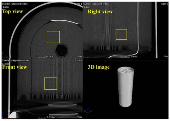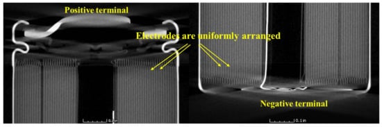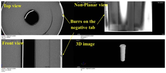Figure 8 shows the magnified CT images for the top and front views of the lithium-ion battery. According to the CT images, a good battery does not have jelly roll deformation, burrs on the electrode tabs, electrode misalignment, or material contaminants (foreign materials).