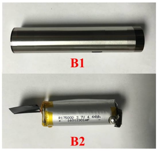 On 29 November 2016, an e-cigarette exploded when the user was pulling the e-cigarette from the charger after charging for 1 h. Since the e-cigarette was totally burned, it cannot be used for further investigation. Hence, two new e-cigarettes of identical make and model were analyzed. Figure 16 shows samples taken from these e-cigarettes. Sample B1 is an e-cigarette battery holder with a built-in cell inside. Sample B2 is a built-in cell taken out of the other e-cigarette battery holder. The exposed wires at the cell terminals were wrapped with electric tape to avoid short circuit. Both B1 and B2 were examined using CT scanning.