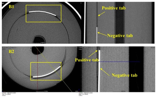 Another observation from the CT scan was that the location of the electrode tabs (Figure 20) showed the poor quality control during the manufacturing process. The electrode tabs usually have higher temperature than the jelly roll due to current concentration. So it is desirable to place the positive and negative tabs at different radiuses and different sides of the jelly roll (see Figure 13) to improve the heat dissipation. However, the electrode tabs were rolled on the same side in B1. This kind of tab design can cause high temperature near the tab region, which can lead to decomposition and stripping of the electrode materials. In addition, the tabs in B2 were overlapped with each other. These tabs are usually electronically insulated from each other by the insulating tapes. However, the high temperature in the overlapped area can lead to melting of the insulation tapes, which can result in a short circuit between these two tabs.