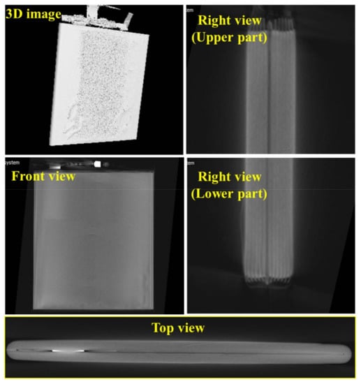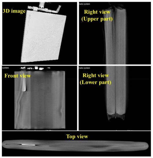 Figure 23 shows the 3D image, right, front and top views of the CT scan of the lithium-ion battery from the new smartphone. The electrode layers are uniformly arranged, and there are no signs of structural deformations as shown in Figure 20.