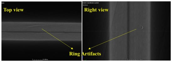 In Figure 24, two bright lines can be seen. These lines have been confirmed as ring artifacts [27,32]. Ring artifact occurs if one of the detector pixels is out of calibration or the pixels have defects or contaminations. These pixels will give incorrect gray-scale readings for each project, resulting in concentric rings in the reconstructed CT images. If the cause of the artifact is determined as out of calibration, the artifact can be eliminated by rescanning the battery after recalibration. However, if the artifact is due to the defective detector, it cannot be removed but can be mitigated using software filtering methods such as the median filter.