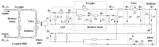 In the DHS modeling and controlling presented in [24], the detailed models of LPs and radiator are addressed. Regretfully, these models are mainly transient state models and are hard to compute. In order to attain a simple steady state model, the typical dual-port network and three-port network are employed, as shown in Figure 2. In this work, four kinds of LP are included, i.e., the tee pipe, reducer union, elbow pipe, and valve. Based on a typical DHS, the formulas of the involved pressure resistances and thermal conductance in Figure 2 can be obtained.