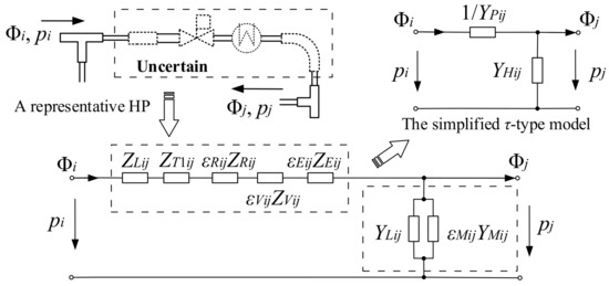Up to now, the simplified τ-type model of the representative HP is attained, as shown in Figure 3. The heat losses and pressure losses of HP can be formulated as Equations (15) and (16), respectively: