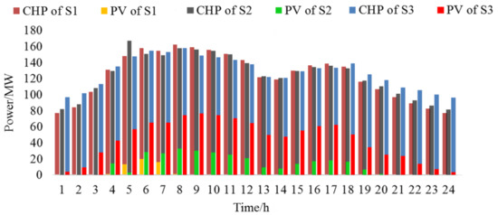 Figure 10. The power outputs of photovoltaic (PV) units and combined heat and power (CHP) plants under three scenarios.