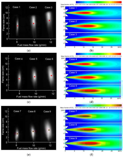 Figure 9 shows the experimental and CFD flame images for fuel mass flow rate ṁF under varying combustor pressures P in Case I (Case 1–9). Note that the experimental flame base is the nozzle divergent end, so the measured flame size shown in images (a), (c), and (e) needs to be summed up with the distance between the nozzle divergent end and the throat to obtain the experimental Lf since the throat is regarded as the nozzle injection exit. One can see that the experimental flame shape elongates and widens as ṁF increases at a fixed P, which is explained by the increase in axial and radial diffusion of the fuel at higher ṁF. The CFD results agreed well with the measurements in the variation trends of flame appearance.
