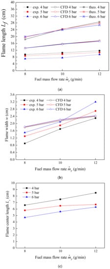 Figure 10b indicates that flame width increased with ṁF at a fixed P for both experimental and CFD results. Since fuel flows along the flame axis and diffuses radially outward, while the air diffuses radically inward, increasing the fuel enlarges the radial position where fs is achieved, and thus a wider flame is produced. The slope of the CFD results is smaller than the experimental ones, which may due to the simplicity of the one-step reaction mechanism in calculating flame width. Figure 10c shows the variation in flame position; as ṁF increased at a given P, the experimental flame center length also increased, this means that the flame moved further downstream, which corresponds to the variation of the flame length.