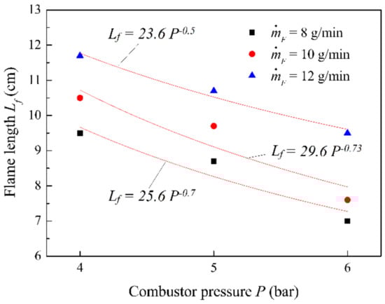 It also can be seen in Figure 9, as the combustor pressure P increased at a given ṁF, the experimental flame shape became shorter and wider, this phenomenon was also observed in [23]. It could be associated with the declined axial diffusion, and enhanced radial diffusion of the fuel at higher P. The measured flame length diminished with the increment of P at a fixed ṁF, as displayed in Figure 11. This trend was also found in [29], where it was pointed out that Lf is proportional to P−2/3, i.e., Equation (12), obtained by introducing the perfect gas state relation Equation (13) in Equation (14).