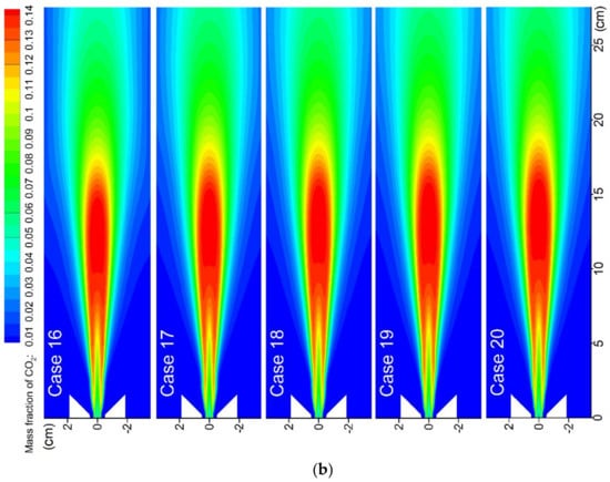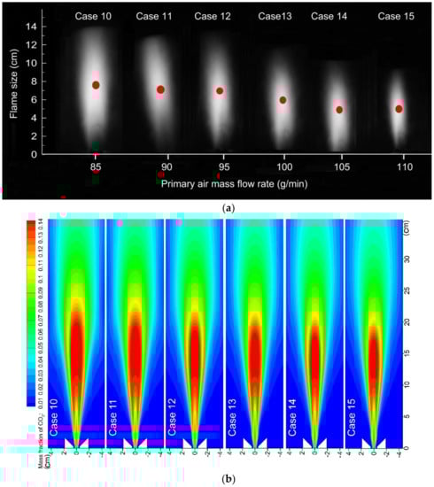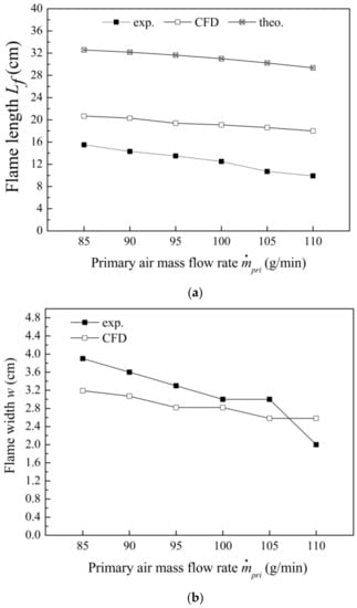 A shorter flame length was observed at higher primary air condition as shown in Figure 13a. Lf diminished with the increase in the primary air for measurement. This phenomenon is mainly attributed to the reduced air entrainment required for diluting the fuel to stoichiometric proportions. A similar result was stated in previous research [30], which measured the flame length for the fuel added with various quantities of air before combustion. Here, considering the primary air in the present experiment as the premixing air of [30], although the primary air does not mix with the fuel entirely as premixing air due to a short mixing distance, then from a qualitative level, the effect of both on flame length is analogous. CFD simulation predicted the diminishing trend of Lf correctly with a nearly equivalent slope, despite some discrepancies in values. The theoretical Lf also showed a consistent decreasing trend as the measured Lf, according to Formula (5). This decreasing Lf can be explained by increasing fs as the primary air becomes larger. However, the values for theoretical Lf were almost twice the measured Lf, this difference is due to the swirl effects, as mentioned above.
