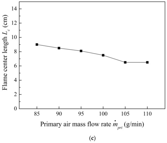 Flame size and position for primary air mass flow rate: (a) Flame length; (b) flame width; (c) flame position.