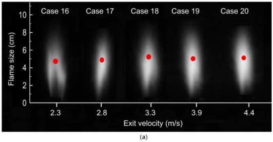 Figure 14 displays the variation in flame shape with an increase in nozzle exit velocity ve at a nearly fixed ṁpri/ṁF. Good agreement was observed in the trends of flame appearance versus ve between experimental images and the CFD solutions. Both illustrate that the flame zone remained unchanged with increasing ve, in other words, the flame volume did not obviously change. This can be attributed to the simultaneously increasing ṁF and ṁpri with ṁpri/ṁF = constant. On the one hand, increasing ṁF is conducive to the enlargement of the flame zone, as discussed in Section 4.2. However, on the other hand, increasing ṁpri is contributive to the reduction of flame volume, as stated in Section 4.4. Both effects seem to cancel each other out. As a result, flame shape and size remain nearly unchanged.
