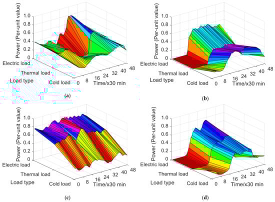 Considering the volatility and uncertainty of the electric/thermal/cold load output of each functional district within a new district, it is necessary to consider the uncertainty influence of each type of load fluctuation when selecting the maximum load of each functional district [,]. Therefore, in ref. [], the fuzzy membership method was used to describe the uncertainty factors which is made the load fluctuation as the triangular fuzzy variable. In ref. [], under the environment of electric power market, the uncertainties of the load fluctuation were taken as random variables that obey a normal distribution, and the Monte Carlo simulations were conducted with consideration of the regularity of the load fluctuation in each functional district which is influenced by numerous factors, such as the environment and climate. What’s more, based on the timing characteristics analysis, the typical daily simulation method has been put forward in some researches. In ref. [,], the timing types are divided by seasons and weather, and a load multi-scenario construction method that depends on timing characteristics is proposed based on the uncertainty of the load fluctuation. According to the uncertainty of the load fluctuation in an active distribution network, an optimal scheduling method based on a multi-scenario was constructed in ref. []. A two-stage robust optimization model was applied in ref. [], and multi-stage and multi-region uncertainties were established for the load fluctuation in the planning year. Therefore, the obtained multi-scenario set, which is constructed by means of the clustering method based on the timing characteristics, can enhance the volatility of the daily output curves of the load fluctuation when compared with the single typical daily curve simulation.